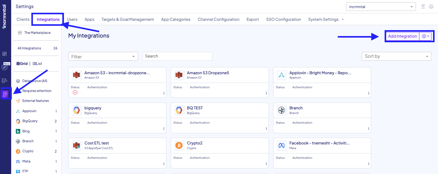 - Navigate to Configuration > Integrations in your INCRMNTAL dashboard