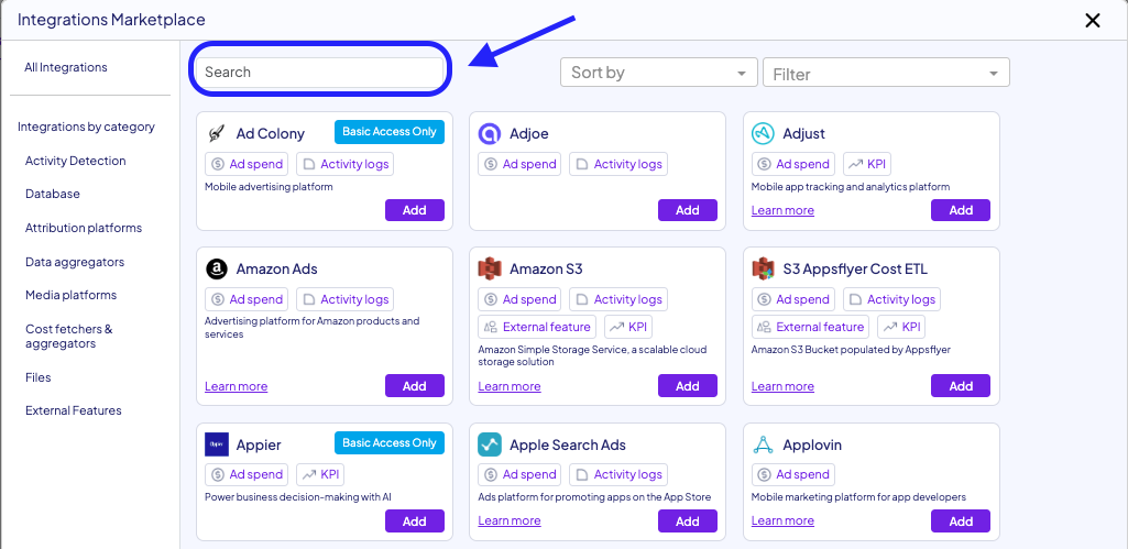3. Search Network you would like to connect in the search row, and click Add. You can read here how to integrate different Networks to the Platform.