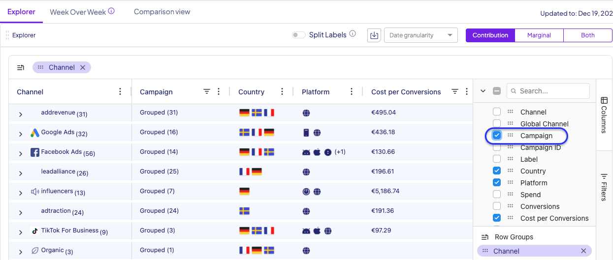 To access the Campaign view in Explorer Pivot, go to the Explorer Pivot tab and enable Campaigns in the left side Column bar, now the Campaign Column will appear in the INCRMNTAL Pivot table.