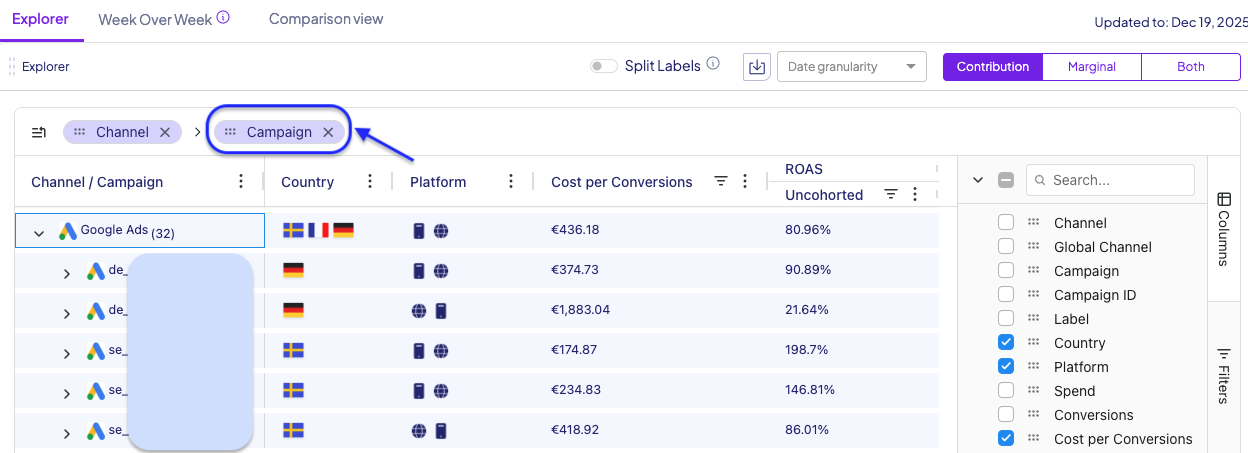 For your convenience we recommend to turn the Campaign Column into Dimension. In order to do so, drag the column up (where usually already is a Channel Dimension).