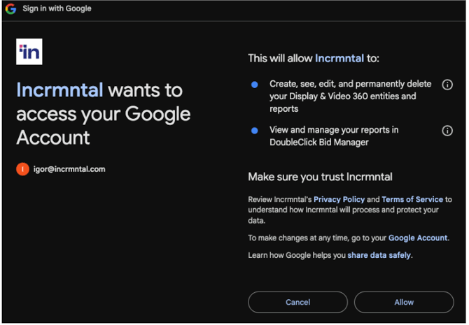 This article explains how to integrate your DV 360 account, allowing the INCRMNTAL platform to read any marketing activities performed in your account.