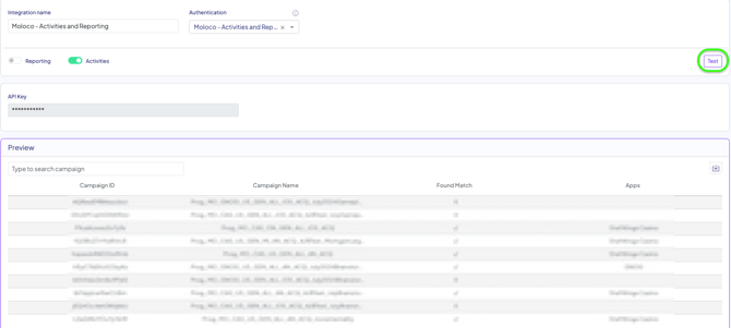- Click "Test". Should the authentication be successful, you'll be able to view your campaigns within Moloco.
