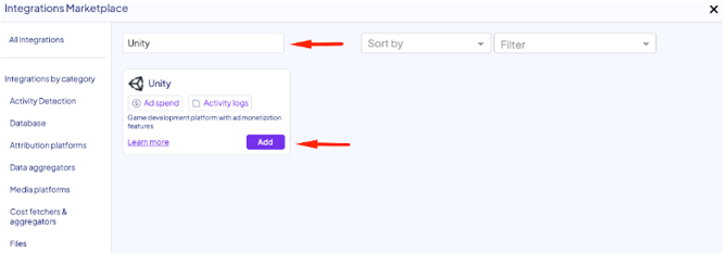 2. Click the Add Integration Button and in the search bar look for Unity, then press Add: