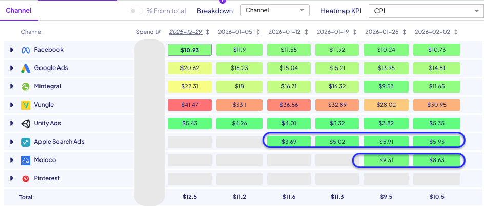 - By looking at your New Channel Performance on different spend levels, you can assess how performance changes as spend increases or decreases - Can this channel scale efficiencies