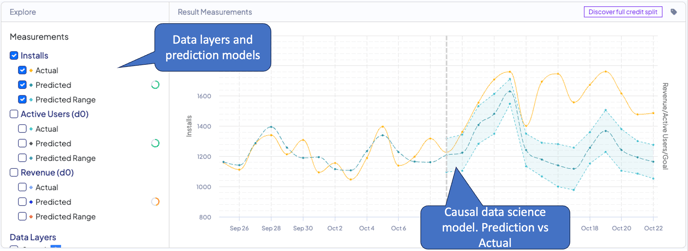 The graph will present you with the factual data (as provided by your data integration), the model prediction (counterfactual), and a prediction confidence range.