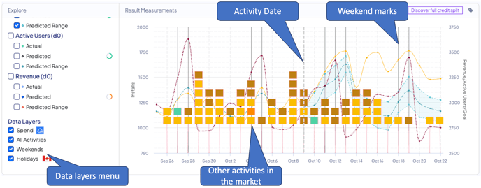 Clicking the Data Layers checkbox will allow you to overlay the graph with other significant logged marketing activities used in the measurement test, and the costs graph for the dimensions of the measured activity.
