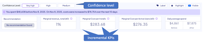 To the left, and below the header, you'll see the adjustable confidence level of the result. This will define the confidence level we utilize for the prediction. By default, we utilize a Very High (95%) confidence level, i.e. only values that exceed or are below the 95% confidence interval will be considered incremental value. There are also the 90% confidence (High) and 50% confidence (medium). We do not recommend relying on measurements with 50% confidence.