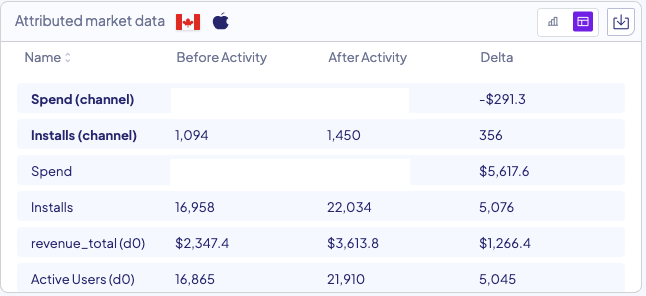 In case there are multiple changes detected on the same entity you measured within the measurement timeframe of 14 days (i.e. several spend changes on a same channel or campaign, at a certain OS and Country), the result will include the incremental value of all the changes that happened within timeframe from the original change you measured.