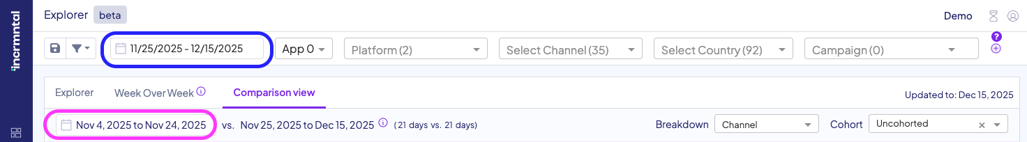 Access Comparison View Dashboard by clicking the Comparison View icon in the Explorer section to compare the selected timeframe, to any other period.