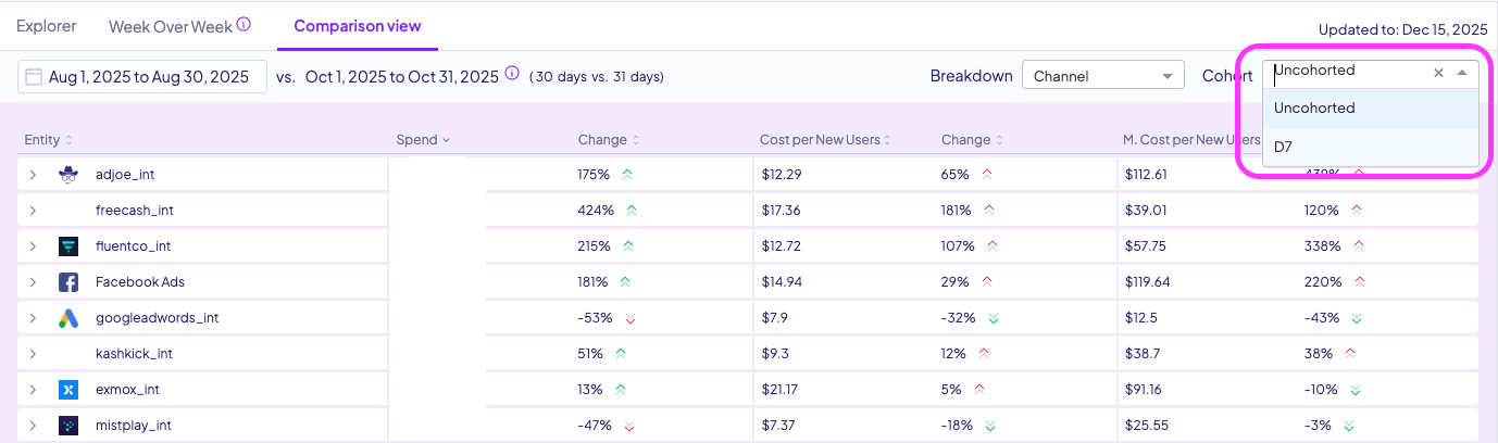 You can select different cohorts for your KPIs from the drop-down menu. You also can select Channel, country, platform or Campaign view from the breakdown